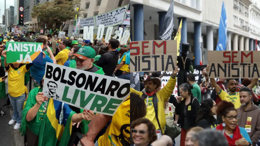 Apoiadores do ex-presidente Jair Bolsonaro realizaram atos em diversas cidades pedindo anistia aos condenados por crimes contra a democracia. Sob o lema “Reaja, Brasil: o medo acabou”, as manifestações tiveram ataques ao STF e ao ministro Alexandre de Moraes. Em São Paulo, manifestantes levaram uma bandeira gigante dos EUA à Avenida Paulista e exibiram cartazes em inglês pedindo novas ações de Donald Trump contra o Supremo. Segundo estimativas do Cebrap e da USP, os atos reuniram 42,2 mil pessoas em São Paulo e 42,7 mil no Rio de Janeiro.