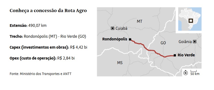 O consórcio Rota Agro Brasil, liderado pela Azevedo & Travassos, venceu o leilão da BR-060/364/GO-MT na etapa de viva-voz, com deságio de 19,70% sobre a tarifa básica de pedágio. O contrato prevê R$ 4,4 bilhões em investimentos e R$ 2,8 bilhões em custos operacionais ao longo de 30 anos. O trecho concedido soma cerca de 490 km, com obras de duplicação, faixas adicionais, vias marginais e quatro passarelas. Estão previstas cinco praças de pedágio, sendo duas em Jataí (GO), e as demais em Portelândia (GO), Alto Garças (MT) e Pedra Preta (MT). (Folha SP)