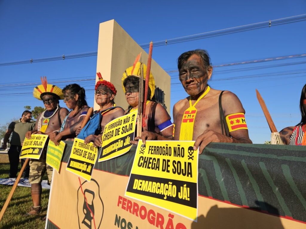 Cerca de 150 indígenas e representantes de movimentos sociais protestaram em frente ao Espaço Reali, em Cuiabá, contra o marco temporal, a PEC que transfere ao Congresso a demarcação de terras e projetos como as ferrovias Ferrogrão e FICO, que, segundo eles, ameaçam territórios indígenas. O ato ocorreu durante o seminário Justiça Territorial, promovido pela Aprosoja-MT e AMM, que defendem um debate técnico e alertam que 22 municípios podem ser afetados por novas demarcações. (RDNews)