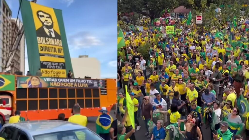 Bolsonaro participou por telefone do ato em Cuiabá e também em outras capitais. “Parabéns a todos vocês que agora se manifestam. Tenham certeza que vocês são a vitória para todos nós”, declarou o ex-presidente, enquanto os manifestantes gritavam “mito, mito”. Impedido de sair aos fins de semana, ele não pode usar redes sociais, mas não está proibido de discursar.