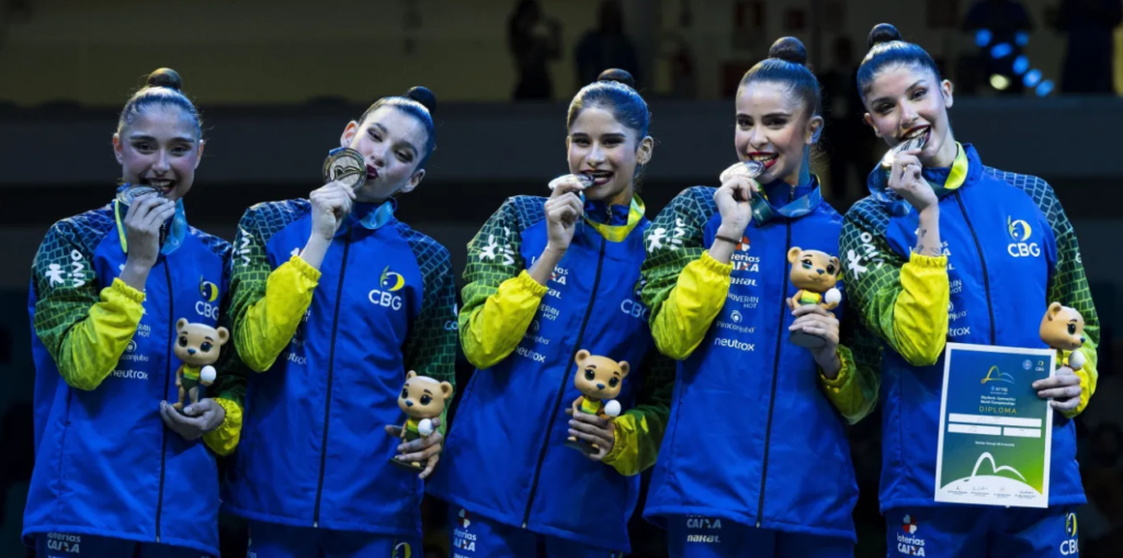 Na final do Mundial de Ginástica Rítmica, realizado no domingo (24), no Rio de Janeiro, o conjunto brasileiro voltou ao pódio. Formada por Duda Arakaki, Nicole Pircio, Sofia Madeira, Mariana Gonçalves e Maria Paula Caminha, a equipe se apresentou ao som do clássico Evidências na série mista, recebeu nota 28.550 e ficou apenas 0.100 atrás da campeã Ucrânia. No sábado (23), o Brasil já havia feito história ao conquistar a prata inédita no conjunto geral, com 55.250 pontos, a apenas 0.300 do Japão, primeiro colocado. (GE)