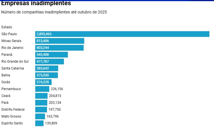 A inadimplência das empresas brasileiras atingiu nível recorde em outubro, com 8,7 milhões de companhias endividadas e R$ 204,8 bilhões em dívidas. Mato Grosso aparece na 13ª posição do ranking nacional, com 163.796 empresas em situação de inadimplência até outubro deste ano. O dado reflete a dificuldade de acesso ao crédito e a menor capacidade de renegociação das dívidas.