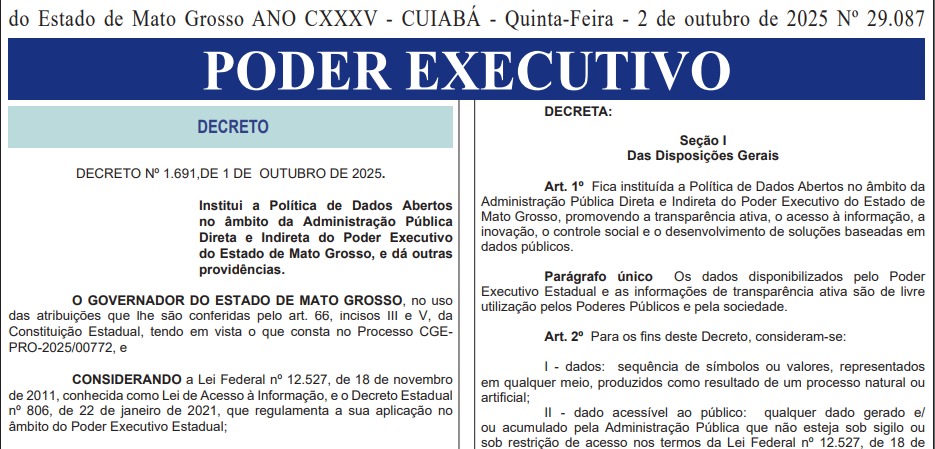 Após ser apontado como último colocado do Centro-Oeste no Índice de Transparência e Governança Pública 2025, com 75 pontos, o governo de Mato Grosso instituiu a Política de Dados Abertos. O decreto publicado no Diário Oficial obriga órgãos estaduais a disponibilizar informações em formato acessível por meio de Planos de Dados Abertos (PDA), com validade de dois anos e revisão anual. A regra vale para dados de interesse público, preservando informações sigilosas ou pessoais. A população poderá solicitar novas bases pelo Fale Cidadão, e o Portal Dados.MT será a plataforma oficial de compartilhamento. (eh fonte)
