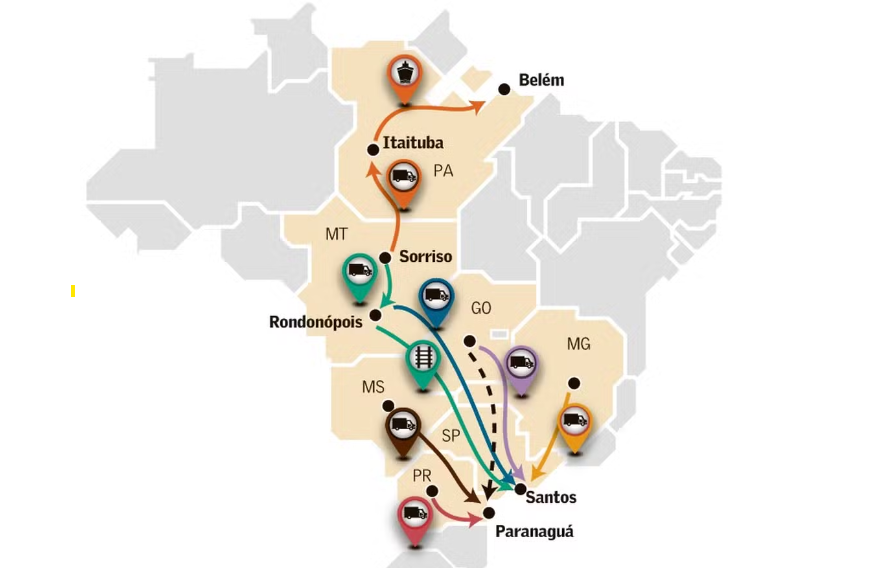 Um levantamento do Grupo de Extensão e Pesquisa em Logística Agroindustrial da Escola Superior de Agricultura Luiz de Queiróz (Esalq-LOG) mostra que, dos US$ 126 por tonelada necessários para transportar a soja do Mato Grosso até a China em 2025, US$ 88,90 foram consumidos no trajeto de 2 mil km em caminhão de Sinop (MT) até Santos (SP), mais que o dobro dos US$ 37/tonelada para levar o grão do porto paulista até o destino final, uma viagem de aproximadamente 20 mil km.
