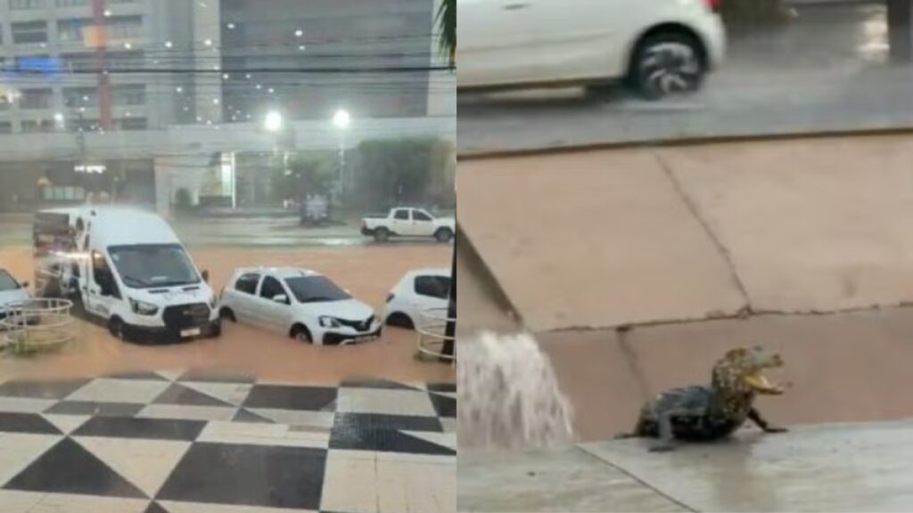A forte chuva que atingiu Cuiabá no domingo (22) provocou alagamentos em vários pontos da capital. A Defesa Civil emitiu alerta para temporais, com risco de enxurradas e descargas elétricas. Ruas ficaram completamente encobertas pela água, e prédios e estabelecimentos ficaram ilhados. Na Avenida do CPA, a via voltou a se transformar em um “rio de lama”, com água alcançando o para-choque dos veículos, situação agravada pelo barro nas obras do BRT.