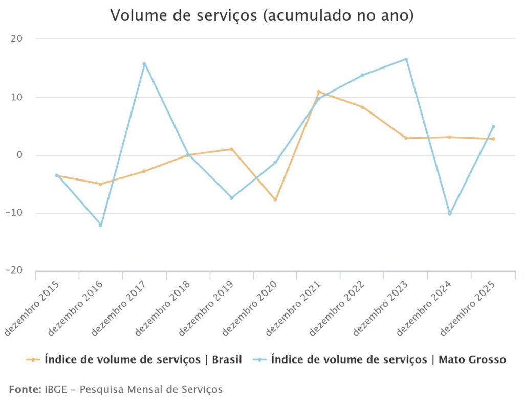 O volume de serviços no Brasil caiu 0,4% em dezembro frente a novembro, mas encerrou 2025 com alta acumulada de 2,8%, segundo o IBGE. Na comparação anual, o setor avançou 3,4%, mantendo sequência de resultados positivos. Em Mato Grosso, o desempenho foi superior ao nacional, com crescimento de 4,3% no mês e salto de 26,3% em relação a dezembro de 2024. No ano, o estado fechou com expansão de 4,9%.