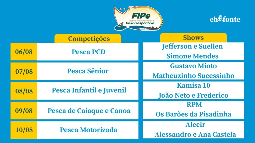 O resgate do Festival nternacional de Pesca (FIPe) de Cáceres às suas origens, com maior participação popular, tem sido um dos marcos das últimas edições. Além da tradicional disputa de pesca esportiva no modelo “pesque e solte”, o festival, que começa nesta quarta-feira (6) e vai até domingo (10), traz uma programação mais eclética, com atividades culturais e sociais diversificadas.