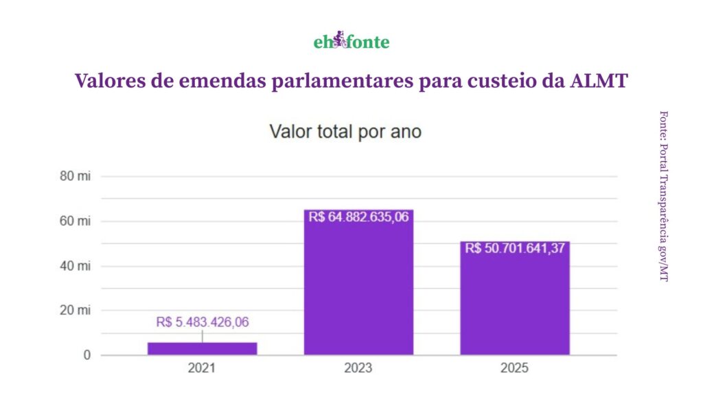 A Assembleia Legislativa de Mato Grosso (ALMT) tem recorrido a emendas parlamentares para cobrir parte de suas próprias despesas de custeio (gastos do dia a dia, como contratos de serviços e manutenção da estrutura). Além do duodécimo, que é a parcela do orçamento estadual destinada ao Legislativo, a Casa usa recursos de emendas de lideranças partidárias para essas despesas. Em 2023, foram R$ 64,8 milhões pagos dessa forma, e em 2025 o valor já soma R$ 50 milhões.
