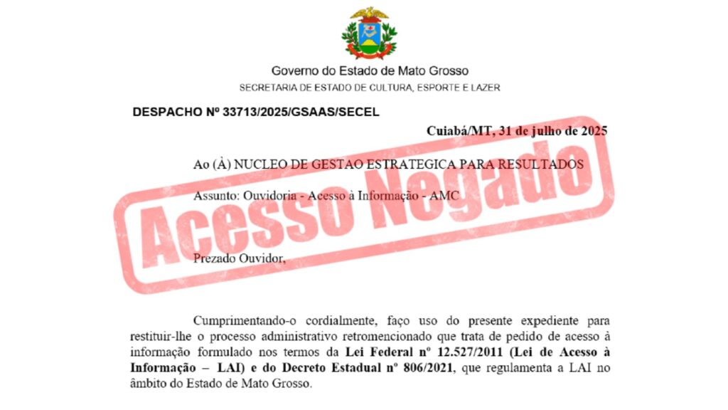O governo de Mato Grosso negou pedidos, feitos por meio da Lei de Acesso à Informação, para divulgar a prestação de contas de projetos executados pela Associação Mato-grossense de Cultura (AMC). A entidade é a campeã de emendas da Assembleia Legislativa de Mato Grosso (ALMT): recebeu R$ 72,7 milhões entre 2021 e agosto de 2025.